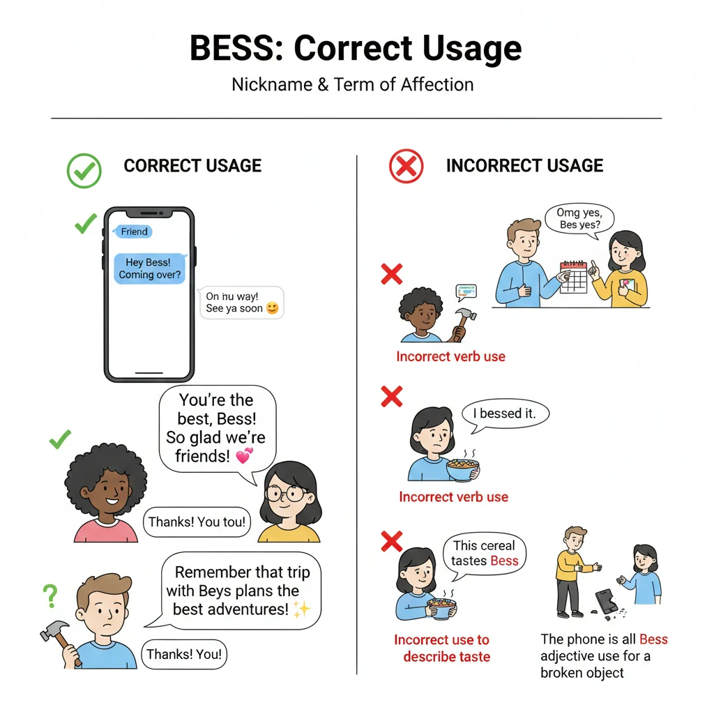While “best” is a formal adjective, “bess” is casual slang. - Assuming it only means “best friend.”